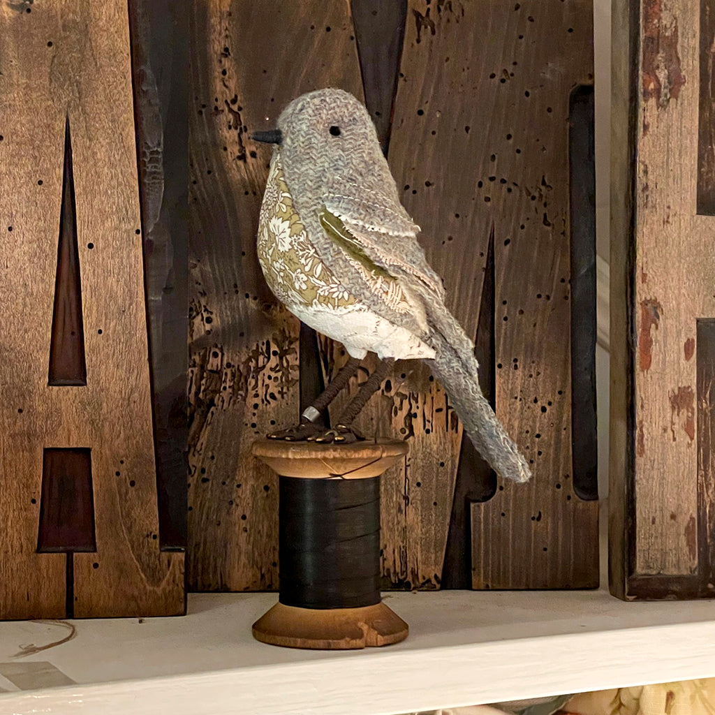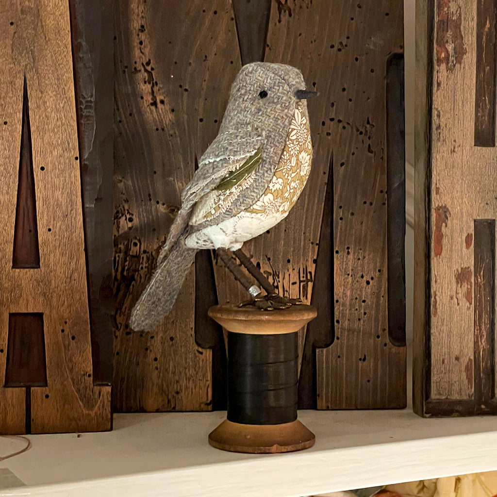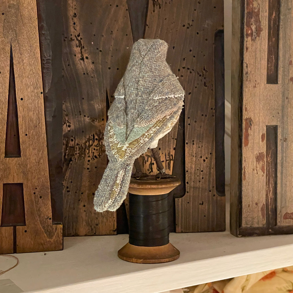 Annette Mackie Handmade - Sage Harris Tweed bird on vintage cotton reel - leg ring no. 136