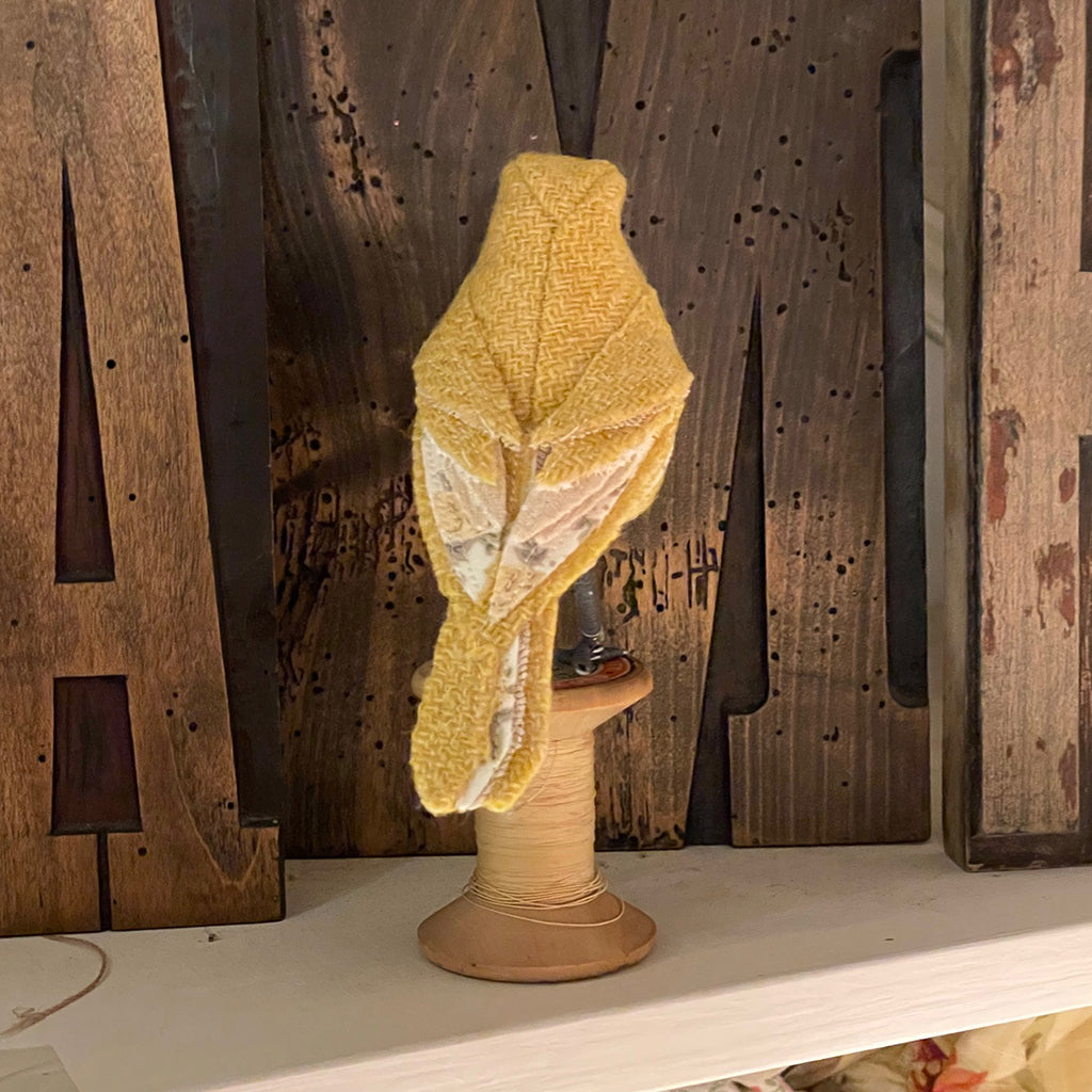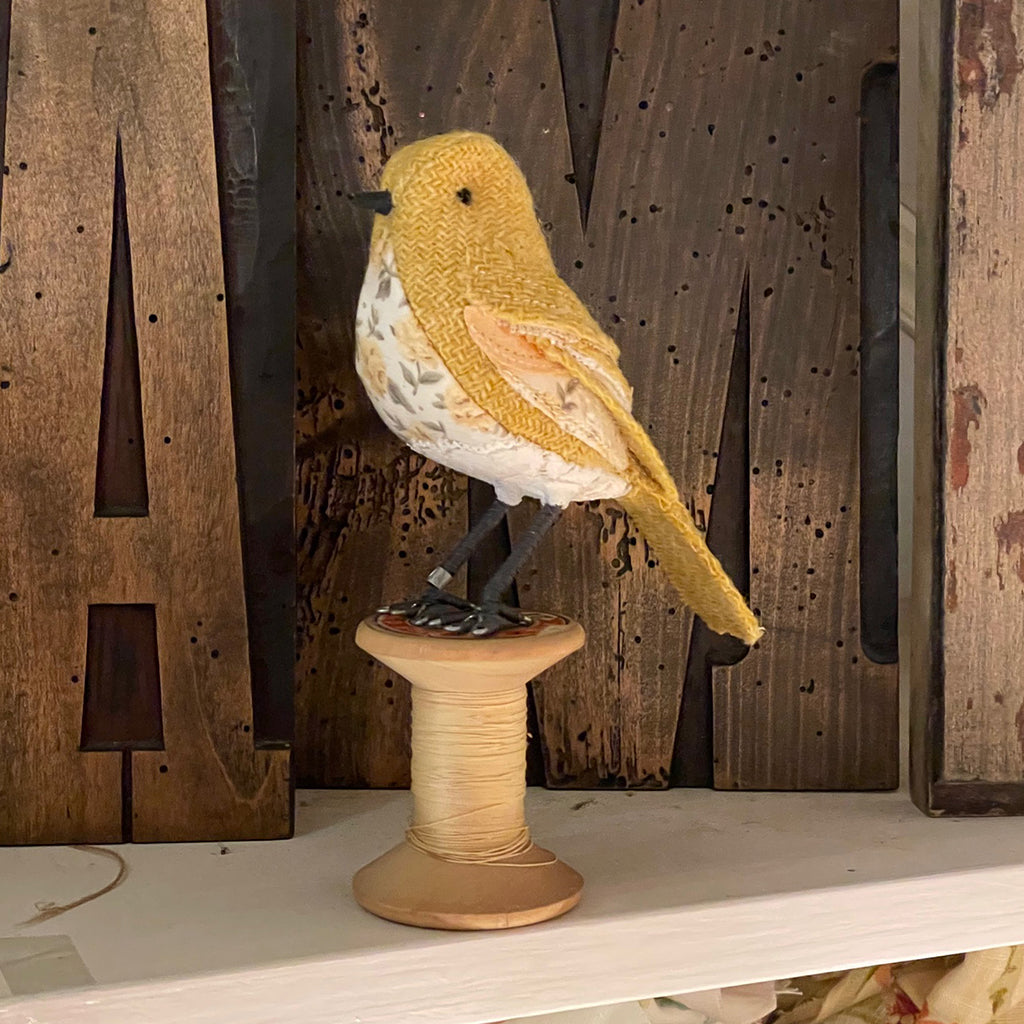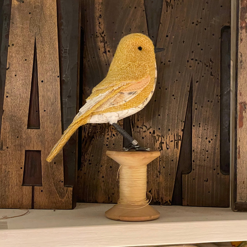 Annette Mackie Handmade -Yellow Harris Tweed Bird on vintage cotton reel